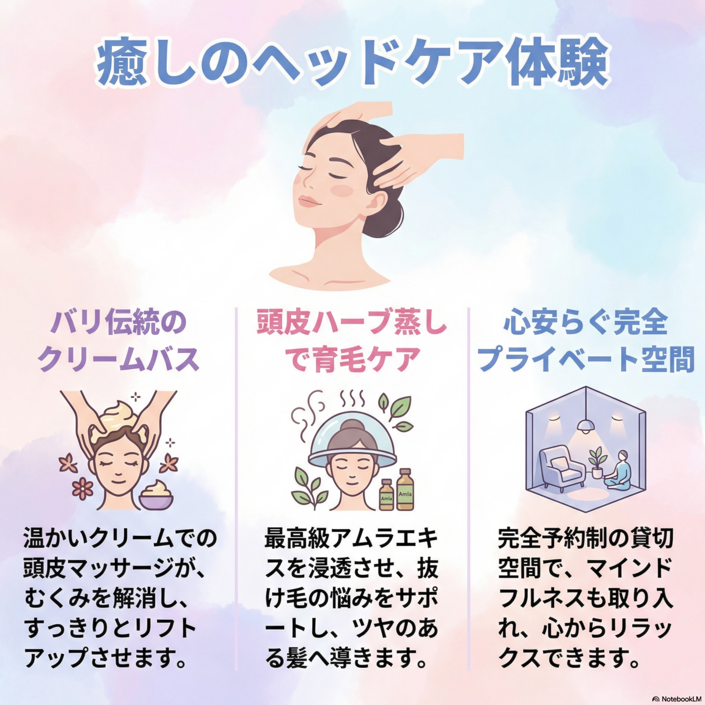 暖かいクリームを頭皮と髪全体に塗布しマッサージを施す。頭皮と顔のむくみも解消。インドネシアのバリ島で500年受け継がれた頭皮マッサージでリフトアップ。