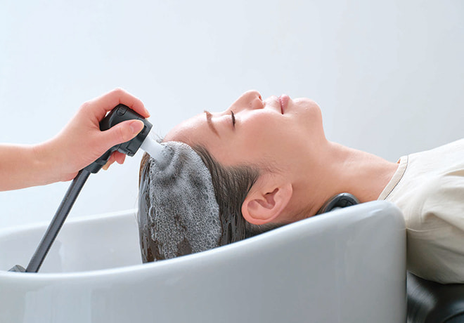 ①まずマイクロバブルシャワーとオーガニックシャンプーで優しく毛穴と頭皮と髪の汚れをクレンジング。